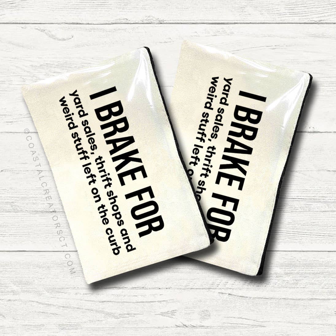 I brake for yard sales, thrift shops, and weird stuff left on the curb canvas zipper bag is individually packaged with a header card. Bags are unlined. Fabric is light beige canvas. Zipper is black. These canvas multi-purpose zipper bags measure approximately 8" wide x 4-1/2" high and feature a cute saying or design on the front. They are perfect for pencils, beauty products, stickers, and more.