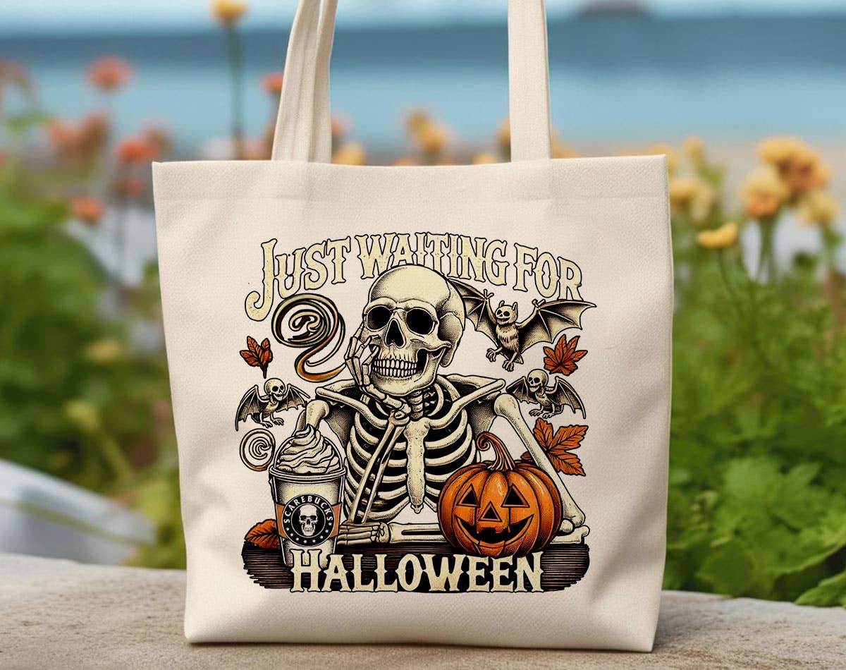 Just Waiting For Halloween Skeleton Coffee Horror Tote Bag 13 x 14 in. natural/off-white color canvas tote bag. A high-quality printed image on one side of the tote. Two shoulder straps with a 9 in. drop make for a comfortable fit. We recommend spot cleaning this item to ensure a long-lasting image. Color may vary on actual product due to differences in screen resolution.